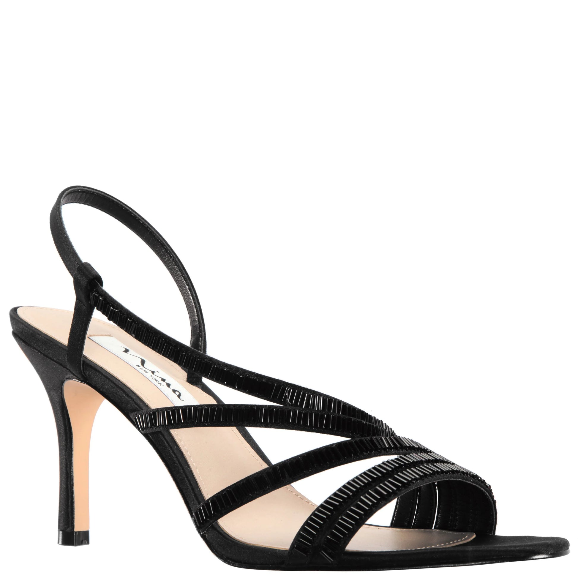 Tonal beads embellish the swirling, asymmetrical straps of an elegant slingback sandal lofted by a tapered heel.