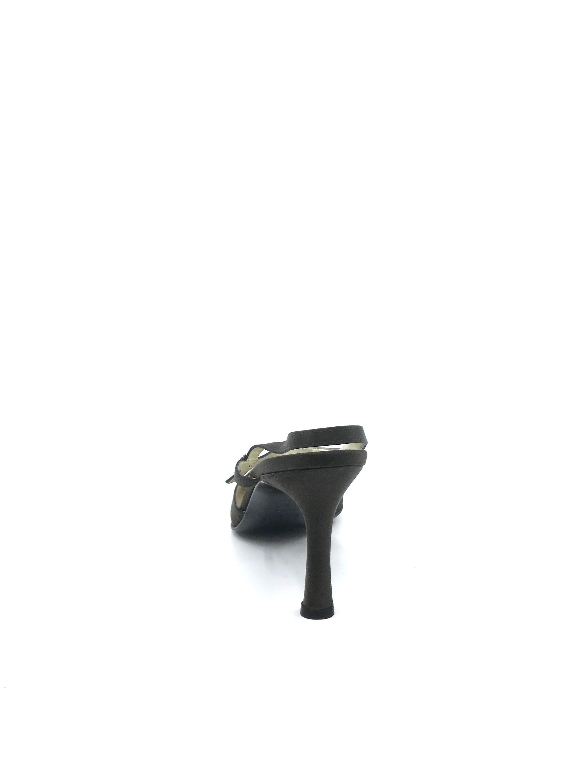- Gorgeous shoes done in brown satin with ankle strap and slingback strap with jewel-encrusted button