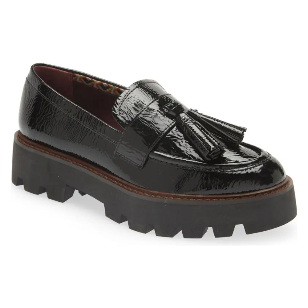 Charming tassels accentuate the vamp of a lofty loafer set on a chunky platform and heavily lugged sole.