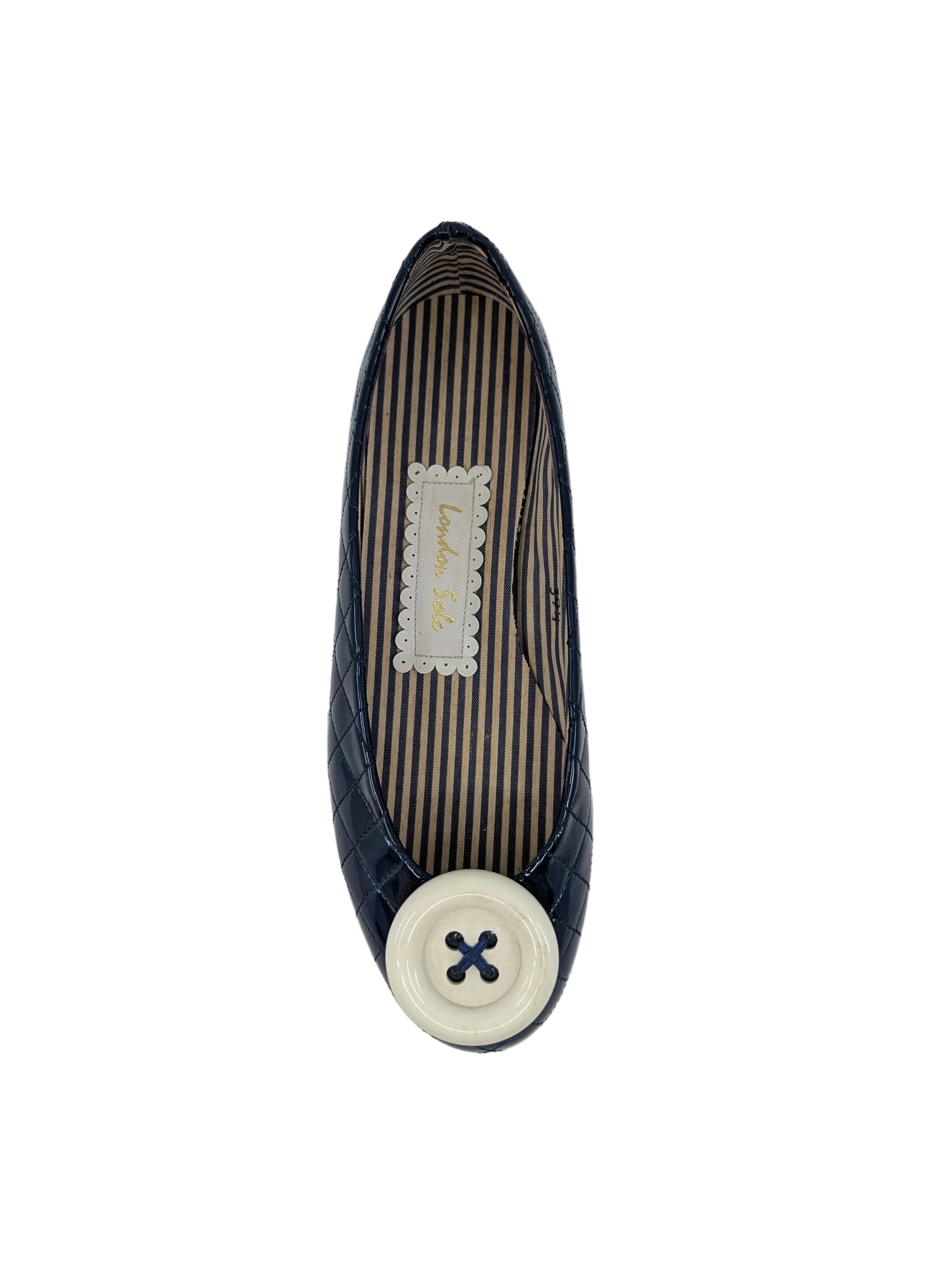 Elevate your everyday style with these timeless London Sole ballet flats in rich navy patent leather. Crafted for comfort and sophistication, these classic shoes transition seamlessly from office to evening, offering a polished look that pairs with virtually any outfit. The sleek patent finish catches the light beautifully, while the ballet-inspired silhouette flatters the foot. Perfect for those who appreciate understated elegance and quality craftsmanship, these flats deliver both style and wearability in one coveted pair.